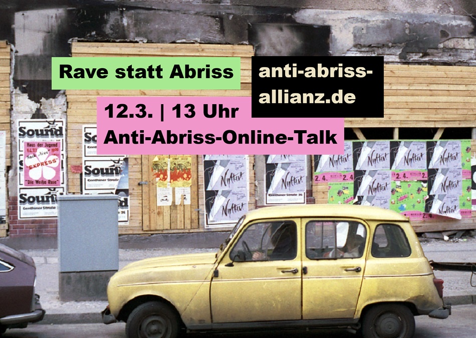 Was würde passieren, nähmen wir die Stadt als offenes Feld? Haben wir schon, zumindest die Ravekultur der 1990er Jahre. Wenn in leerstehenden Häusern und Fabrikhallen, auf Brachflächen und ungenutzten Zwischenräumen auf Zeit getanzt und bei Musik gefeiert wurde. Charlotte Emmler, Gregor Bläsi und Julia Sohl haben untersucht, wie diese subversive Praxis bis heute in Berlin weiterlebt. Jenseits bürgerlicher oder gar gesetzlicher Regeln wird Stadt neu und kreativ und manchmal auch brutal neu verhandelt. Im Anti-Abriss-Online-Talk berichten Emmler, Bläsi und Sohl, ob solche improvisierten, spontan umgebauten oder auf Zeit genutzten Räume als Strategie für unsere heutige und zukünftige architektonische und soziale Praxis taugen.
